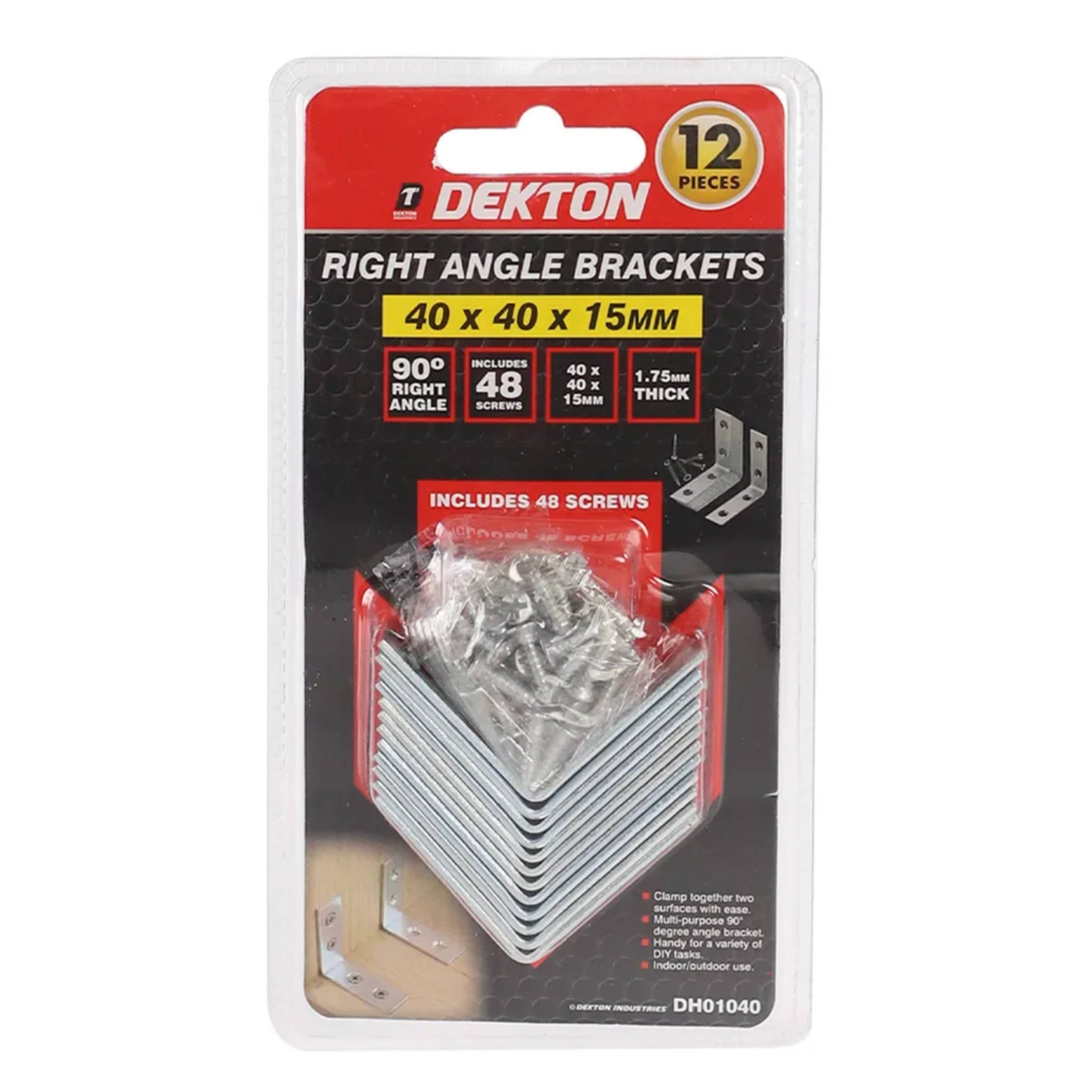 Introducing the DEKTON 16PC Right Angle Bracket Set, essential accessories for woodworking and construction projects. These sturdy brackets are designed to securely clamp two surfaces together at a precise 90-degree angle, providing reliable support for a variety of applications, from shelving and framing to general repairs.