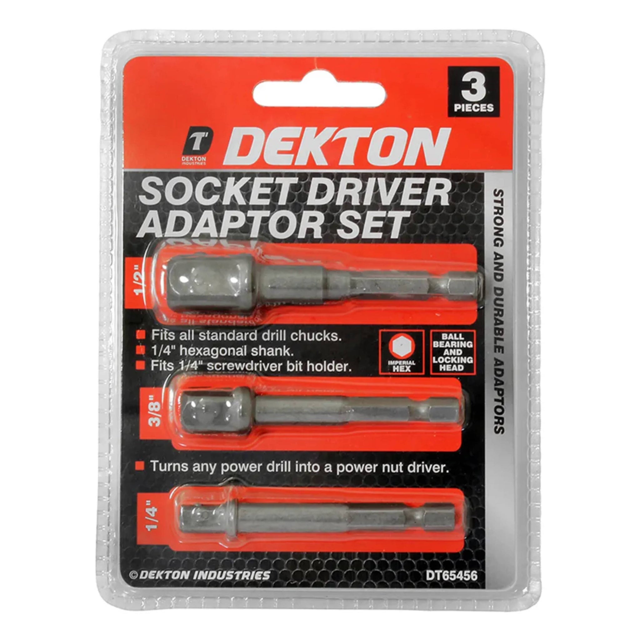The DEKTON 3PC Socket Adaptor Set is a versatile accessory designed to enhance the functionality of your power drill, turning it into a power nut driver for added convenience and efficiency.