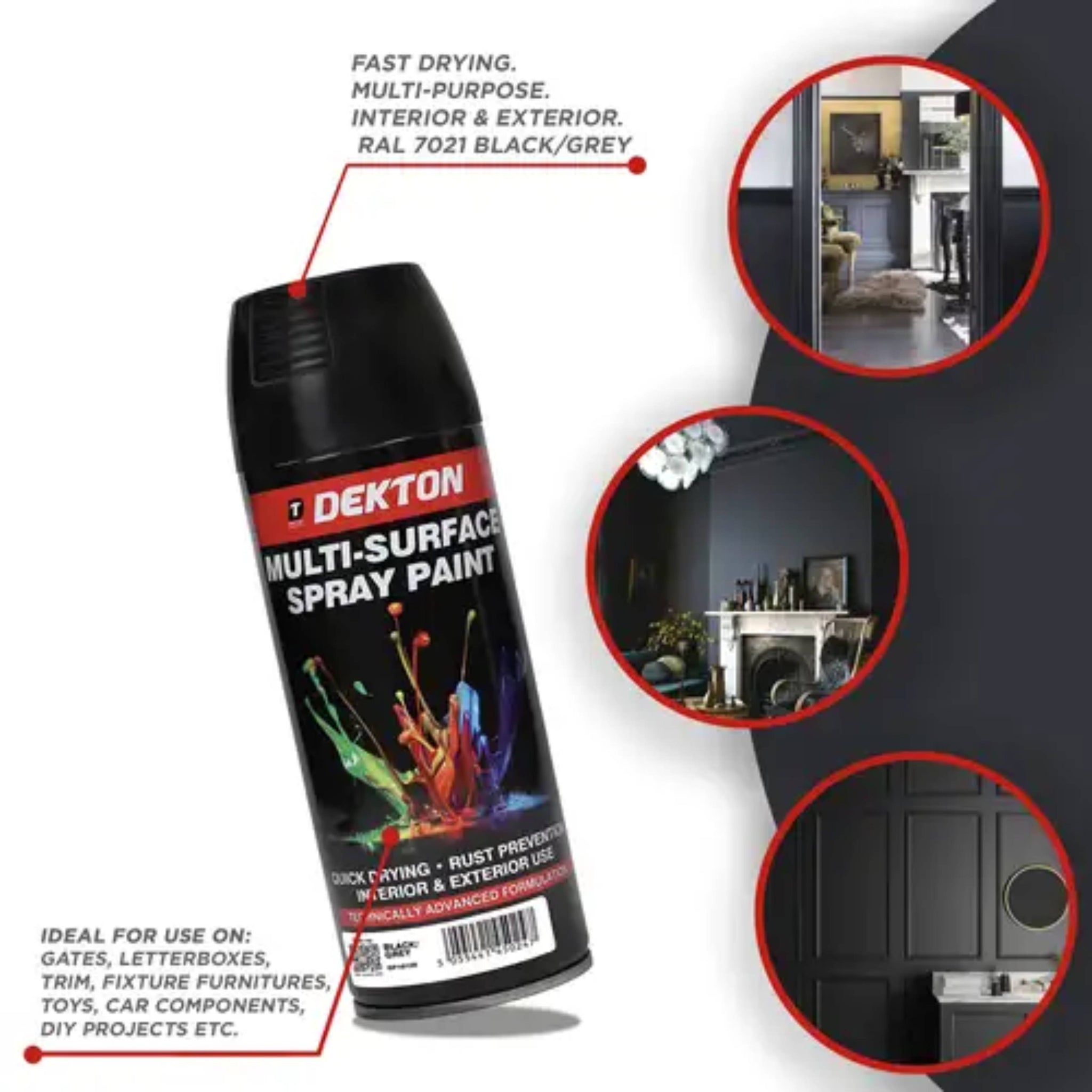 Versatile Use: Whether you're updating furniture, reviving metal fixtures, or enhancing decorative elements, DEKTON Spray Paint Black/Grey is your go-to solution. Its multi-purpose design makes it suitable for various surfaces, including wood, metal, plastic, and more.