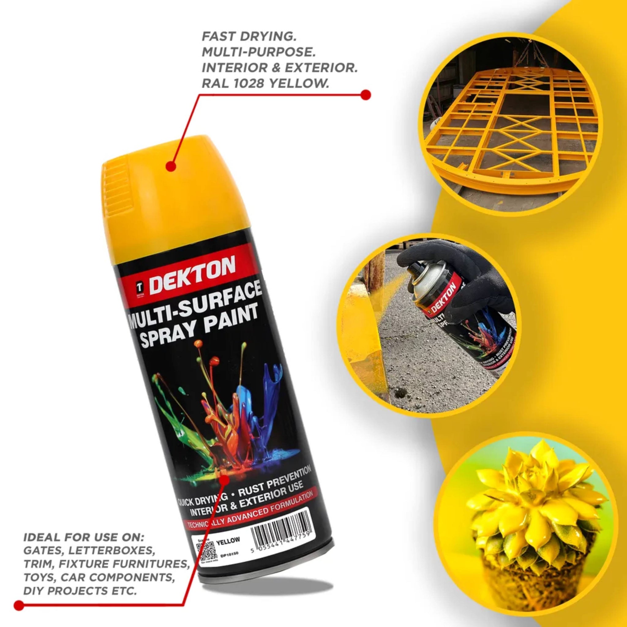 Enhance your projects with DEKTON Spray Paint Yellow. With its versatile use, fast-drying formula, suitability for interior and exterior applications, rich RAL 1028 Yellow finish, easy application, and exceptional coverage, it's the perfect choice for achieving professional results every time.