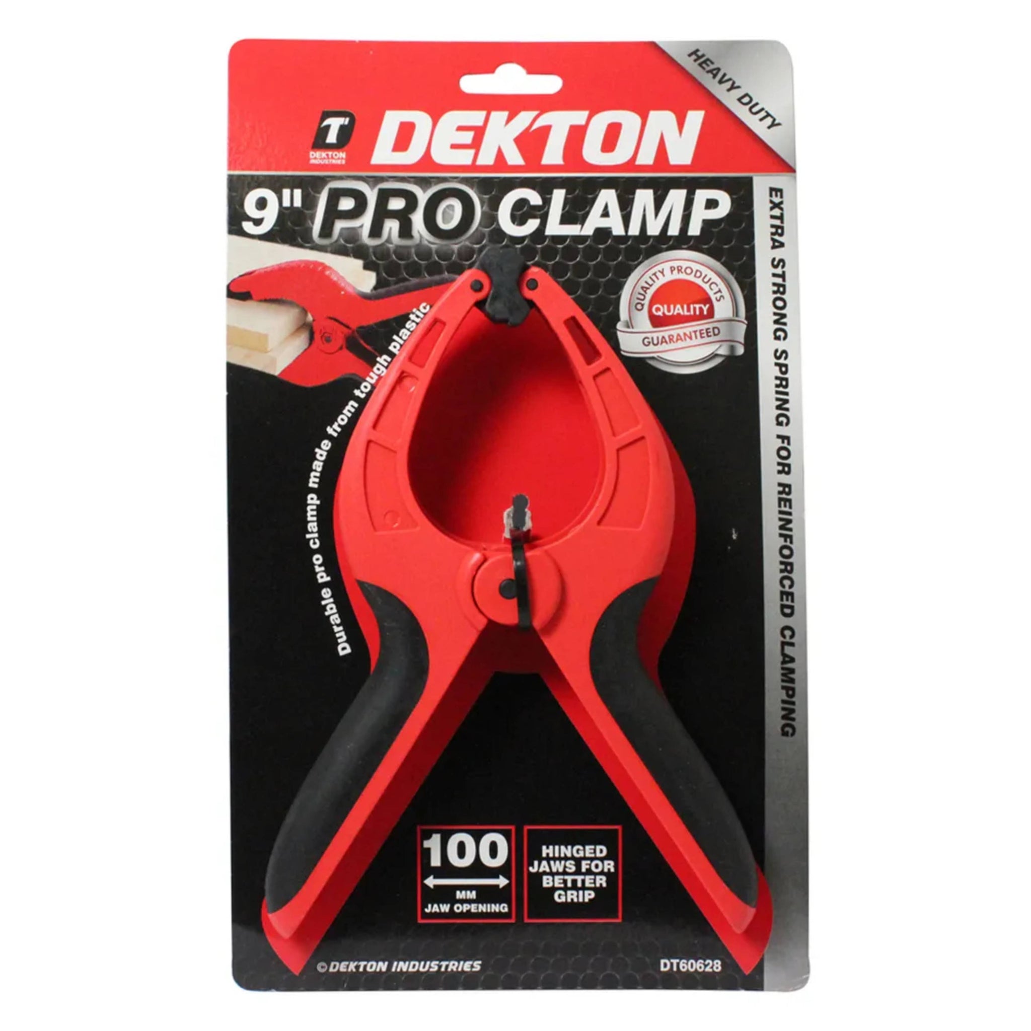 Upgrade your clamping tools with the DEKTON 9" Pro Clamp. With its 100mm jaw opening, heavy-duty rubber non-slip grip, durable construction, and hinged jaws for better grip on uneven surfaces, this clamp offers the strength, reliability, and versatility needed for a wide range of clamping tasks in your workshop or job site.