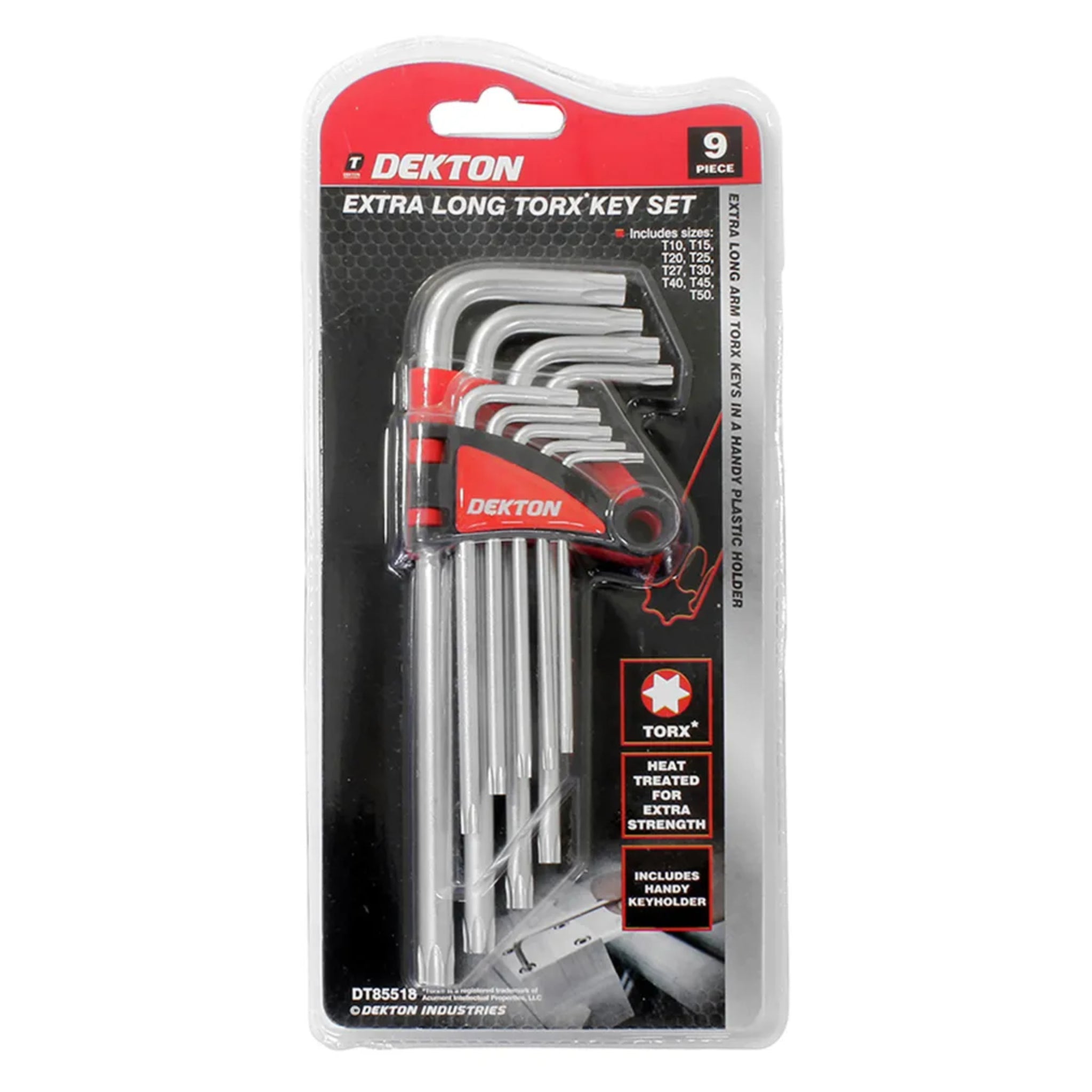Introducing the DEKTON 9PC Long Arm Torx Key Set, a durable and versatile toolset designed for professional and DIY use. With its long arm design and heat-treated construction, this set is ideal for reaching deep or hard-to-access fasteners and providing extra leverage.