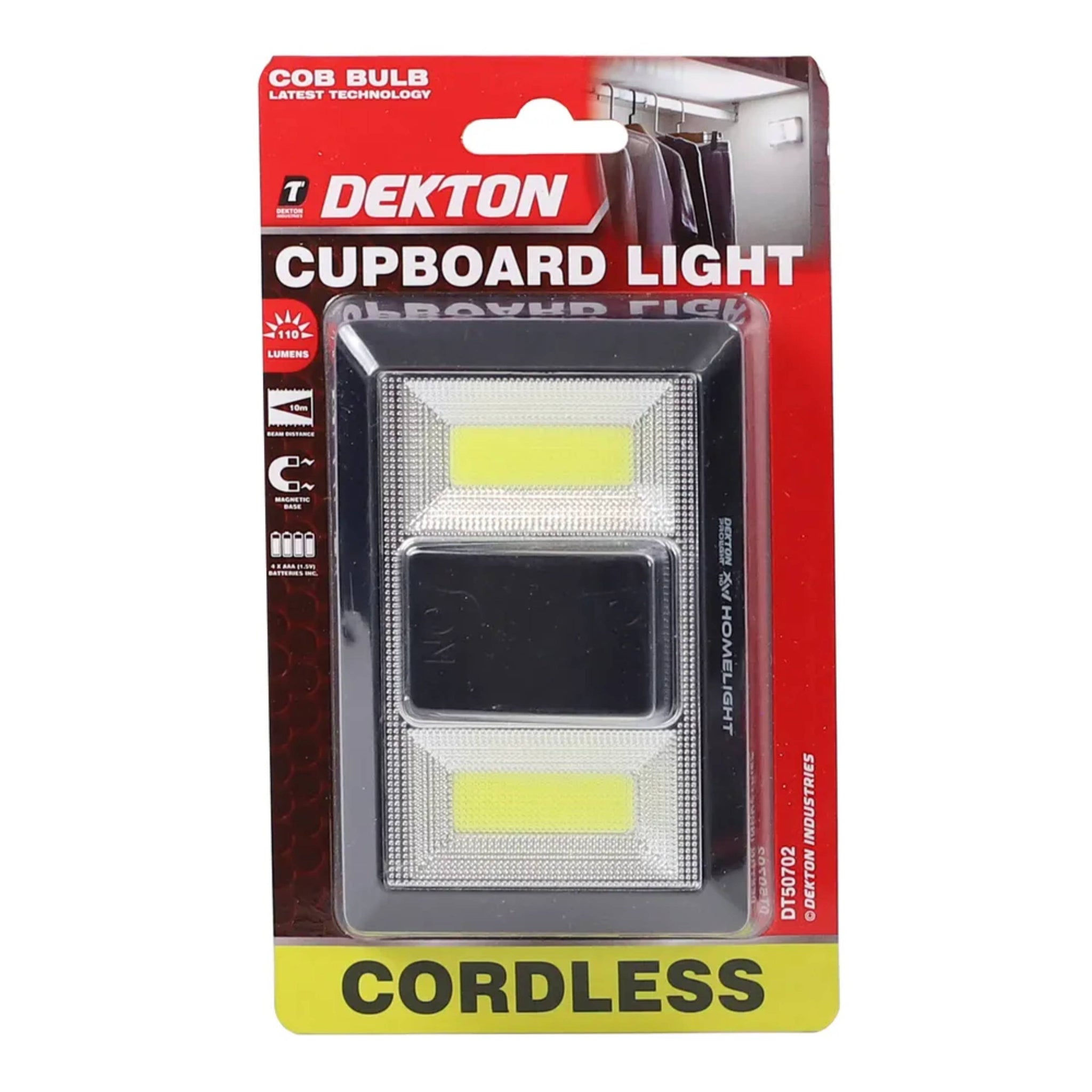 Introducing the DEKTON Pro Light XW110 Sunshine Homelight, a compact and versatile lighting solution designed to brighten up your workspace with ease. Measuring 77mm x 114mm, this homelight features high-intensity COB LEDs that deliver a powerful illumination of 110 lumens, casting a bright and uniform light over a distance of up to 10 meters. With its convenient one-button operation, you can easily turn the light on and off with a simple press.